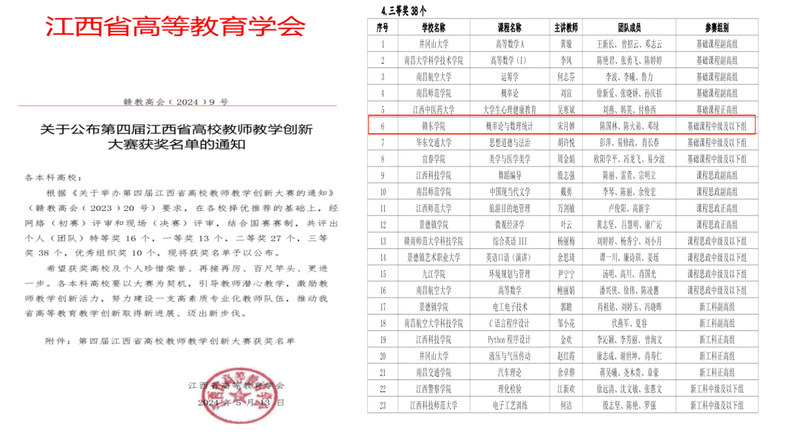5月20日,江西省高等教育学会公布第四届江西省高校教师教学创新大赛获奖名单,我校基础教学部宋月婵老师《概率论与数理统计》课程教学团队荣获基础课程中级及以下组三等奖,实现了我校在该项赛事上省奖“零的突破”。