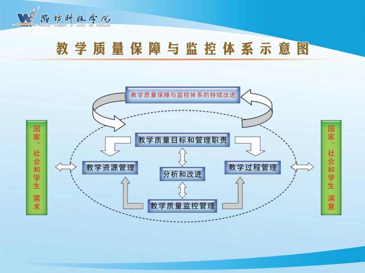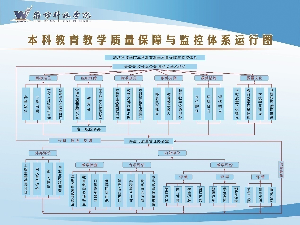 潍坊科技学院落实“学生中心、产出导向、持续改进”理念,坚持“全员参与、全过程监控、全方位评价”的基本原则,不断完善“6233”质量保障与监控体系建设(6233质量保障与监控体系是指建立六个子系统:目标定位系统、组织保障系统、标准规范系统、条件支撑系统、激励系统、质量文化系统),实施两方评价:内部评价、外部评价,落实三维监控:教学检查、专项评估、教学评价,开展三评活动:评教、评学、评管,修订质量标准、完善质量管理、加强质量改进,将质量意识、质量标准、质量评价、质量管理等落实到教育教学各环节,推动质量监控走向质量文化,提升本科教育教学的质量保障能力,促进人才培养质量提升。